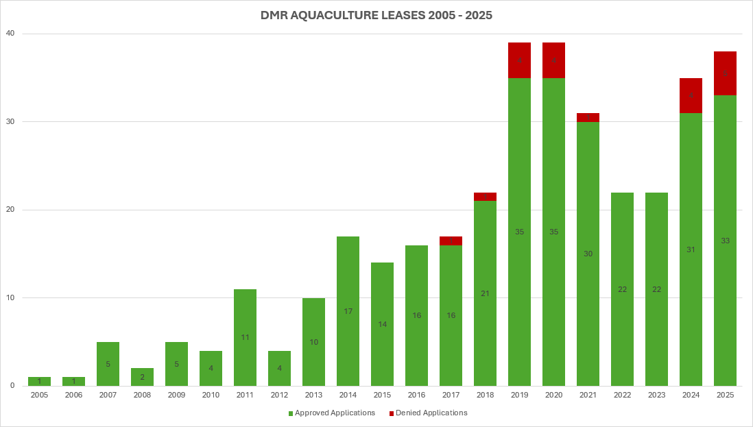Over the two-decade period from 2005 to 2025, Maine’s aquaculture lease approval rate averaged roughly 97%.